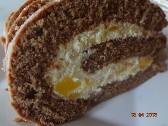 Valuta ja kuutioi mangoviipaleet. Vaahdota kerma ja lisää siihen sitruunamehulla notkistettu tuorejuusto, mangokuutiot ja loput täytteen ainekset. Levitä täyte torttupohjalle ja rullaa koko komeus pitkän sivun suuntaisesti (tai niinkuin me anarkistit, lyhyen sivun suuntaisesti) leivinpaperin avulla. Kietaise leivinpaperissa oleva rulla vielä keittiöliinaan ja anna tortun kiinteytyä jääkaapissa.
